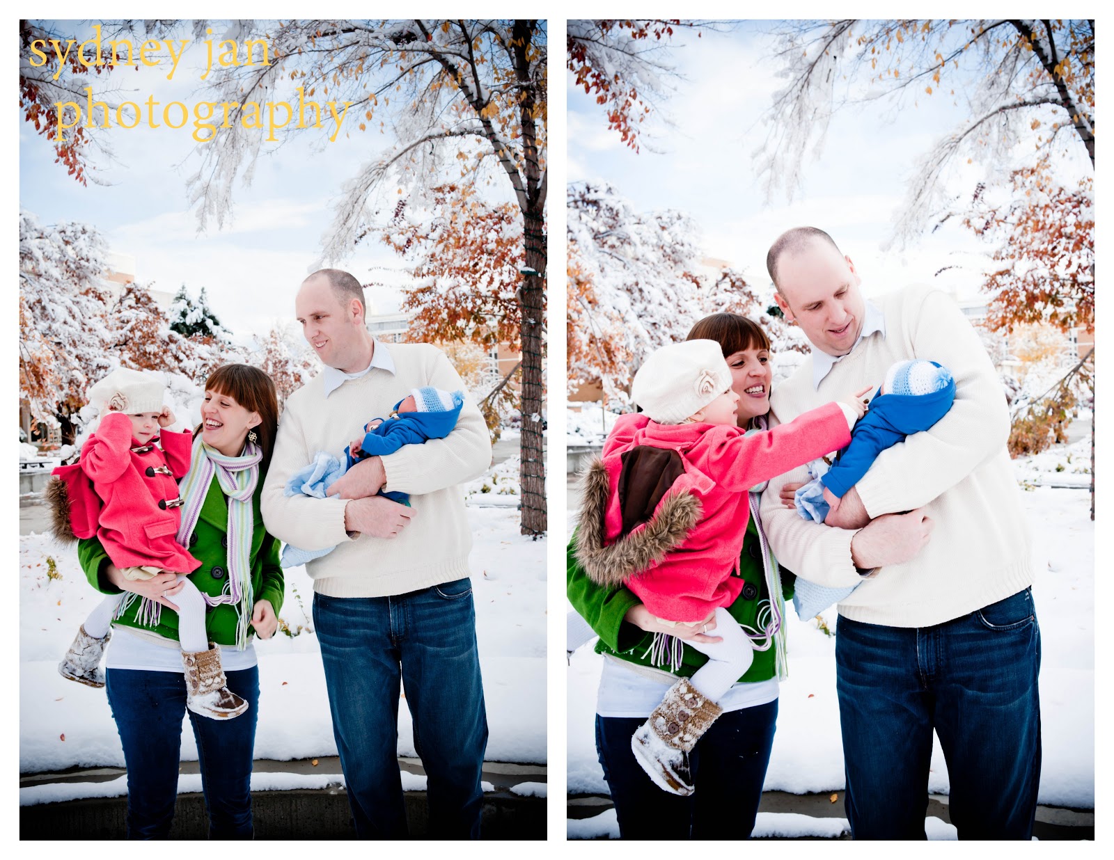 These guys are the best! I started working with them when Mckynlee was born and needing newborn pictures. They just welcomed their newest member into their family recently. He was a little gem for me. It just so happened that it snowed that weekend so it made for some fun outside pictures. I LOVE pictures in the snow! How cute are their colorful coats with the white backdrop? Super.